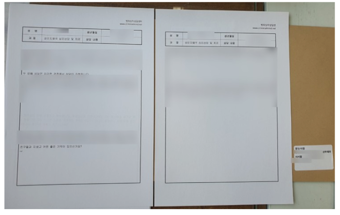 단지 차이점은 불구속 상태의 분들의 경우 컴퓨터를 이용해 상담을 진행하지만, 구속 수감된 분들의 경우 자필로 작성해야 한다는 점입니다.