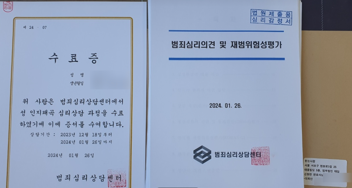 상담을 끝난 후 범죄심리상담의견서 및 한국판성범죄자재범위험성평가를 변호인을 통해 법원으로 제출하였고 다행히 선처를 받아 다시 사랑하는 가족의 품으로 돌아갈 수 있었습니다.