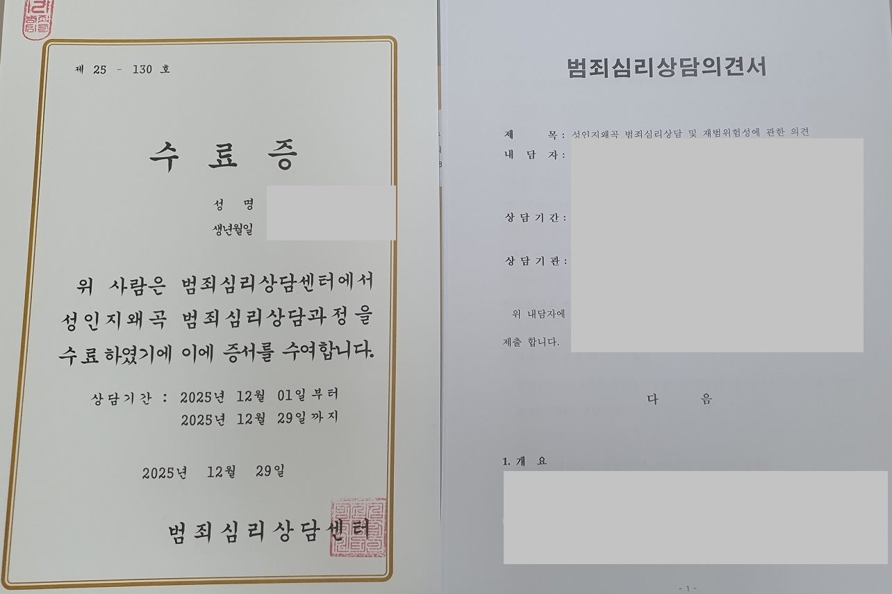 | 아청법 양형자료 및 양형기준, 성범죄심리상담소견서 제출 (0) | 2026.02.25 |