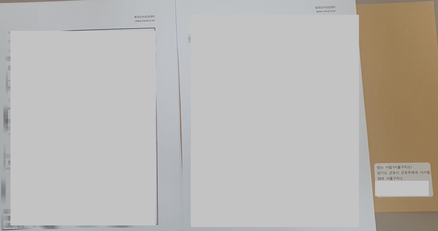 이번 상담은 피의자가 수감 중이어서 서신을 주고받는 방식으로 진행되었습니다. 저희 센터는 구치소·교도소에 수감 중인 상태에서도 서신 상담을 통해 심리검사와 법원 제출용 의견서 작성이 가능하며, 재판 일정이 가까운 경우에도 신속히 대응하고 있습니다. 직접 내방이 어려운 상황이라도 상담 진행에 제한이 없으므로 언제든지 문의하실 수 있습니다.