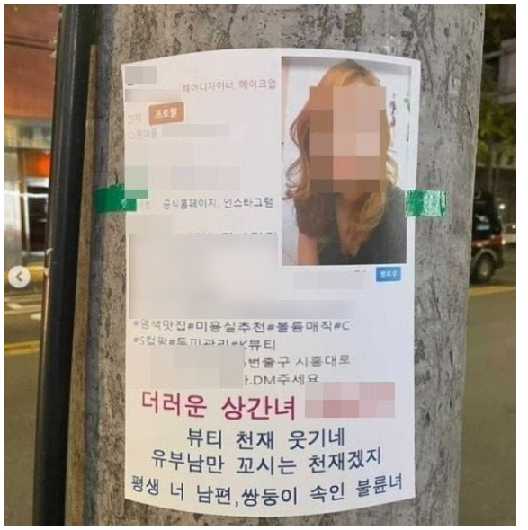 이 전단지에는 미용실을 운영하는 원남숙 원장의 이름, 사진, 사회관계망(SNS) 주소, 전화번호 등 인적사항이 포함되었는데요. 또한 “더러운 상간녀”, “메이크업 천재 웃기네”, “유부남만 전문적으로 꼬시는 천재겠지”, “불륜을 했으면 이런 개망신은 당해야지”, “쌍둥이 속인 불륜녀”라는 내용의 입에 담기도 민망한 글이 있었습니다.