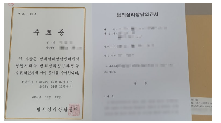 저희 센터는 5회기 상담 후 성범죄 재범위험성평가를 포함한 약 50페이지 분량의 의견서를 법원에 제출합니다.